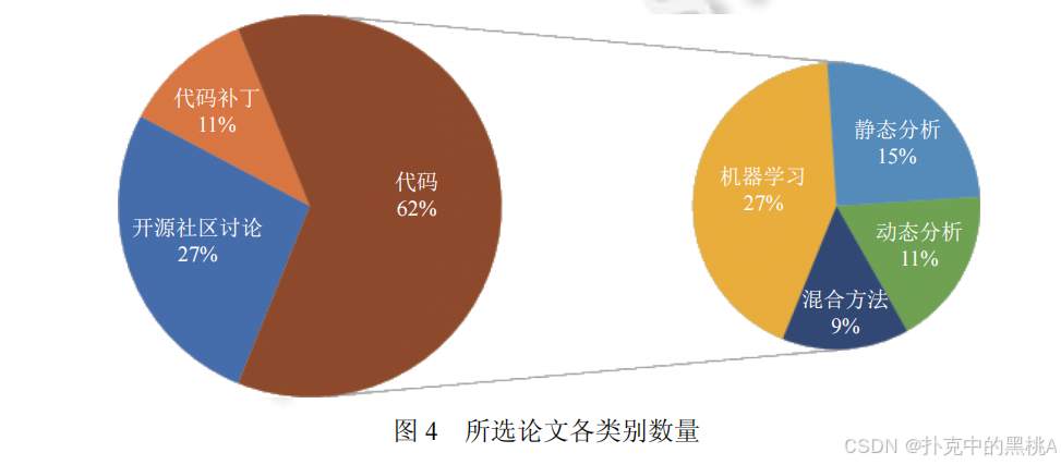 图 4 直观展示了当前研究的分布:基于代码的漏洞感知技术仍是主流(62%),而基于社区讨论和补丁的技术虽占比不高,但增长潜力大,是未来研究的重要方向。