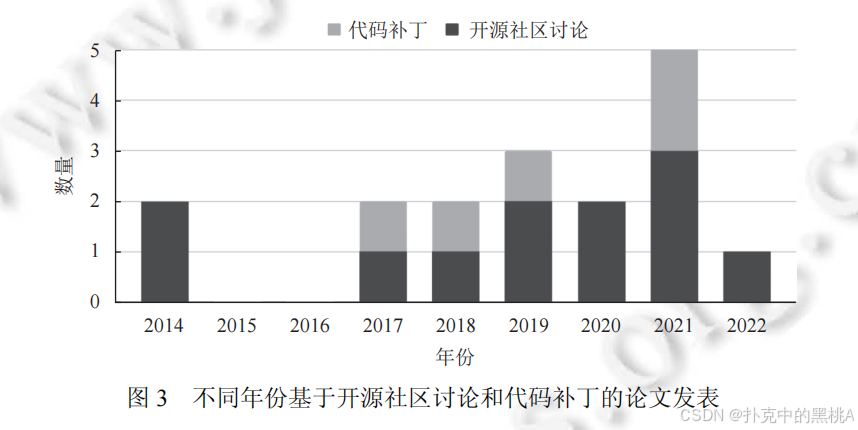 从图 2 可以看出,漏洞感知领域的研究论文数量逐年递增,尤其是 2018 年后增速明显,说明该领域受到越来越多关注。而基于社区讨论和补丁的研究起步较晚(如图 3 所示),仍是待探索的蓝海。