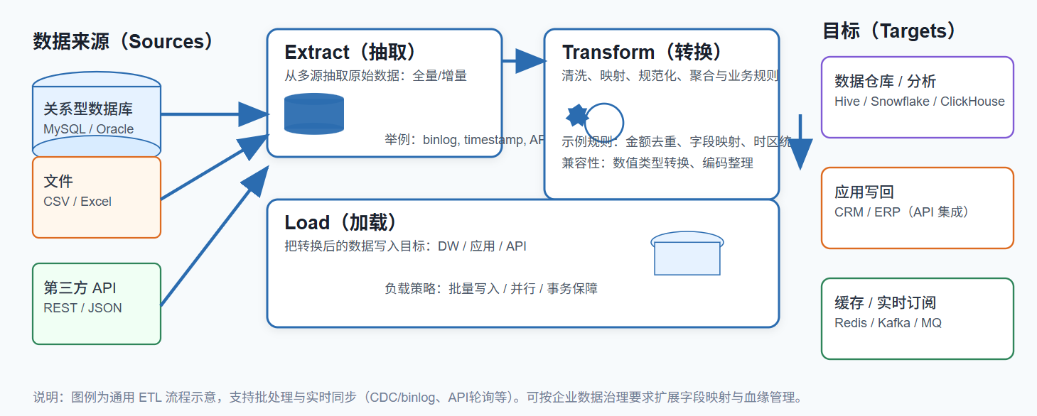 而ETL工个就是 Extract(抽取)、Transform(转换)、Load(加载) 三个单词的缩写。它的本质是一种数据处理流程,用来把数据从一个或多个来源系统中抽取出来,经过清洗、转换和业务规则处理后,再加载到数据仓库中。