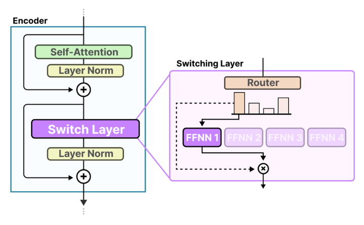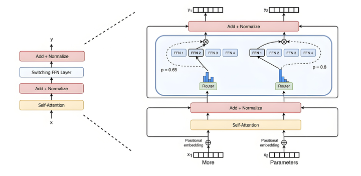 当输入数据进入模型时,首先通过一个门控机制进行筛选。该机制由一个前馈神经网络(FFNN)实现:输入(x)乘以路由器权重矩阵(W)后,应用SoftMax函数生成概率分布G(x)。这个分布表示输入与各个专家的相关性权重。例如,在一个包含四位专家的MoE层中,门控输出可能为:专家1(45%)、专家2(19%)、专家3(5%)、专家4(31%)。概率越高,表示该专家对当前输入任务越重要。门控机制的核心是动态路由,确保模型根据输入内容精准分配计算资源。