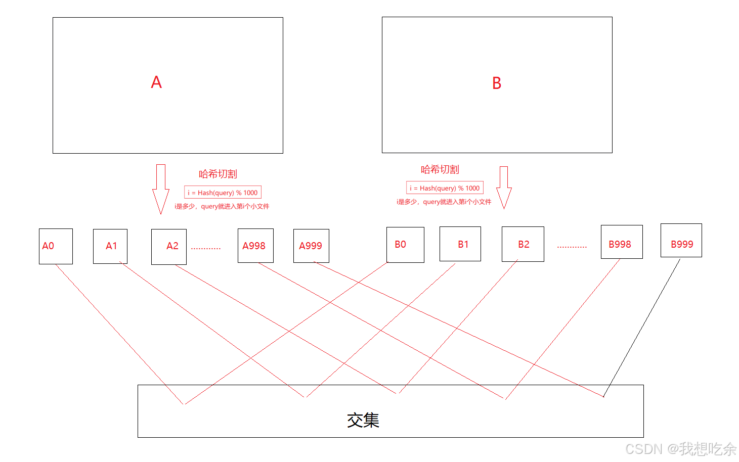 本题我们可以分别将两个海量数据文件分割为1000份: 假设两文件分别为A和B A被分为(A0,A1,A2,……,A998,A999) B被分为(B0,B1,B2,……,B998,B999)