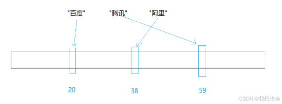 假设经过字符串哈希算法计算后,“百度”对应20,“腾讯”对应59,“阿里”对应38,映射结果如下: