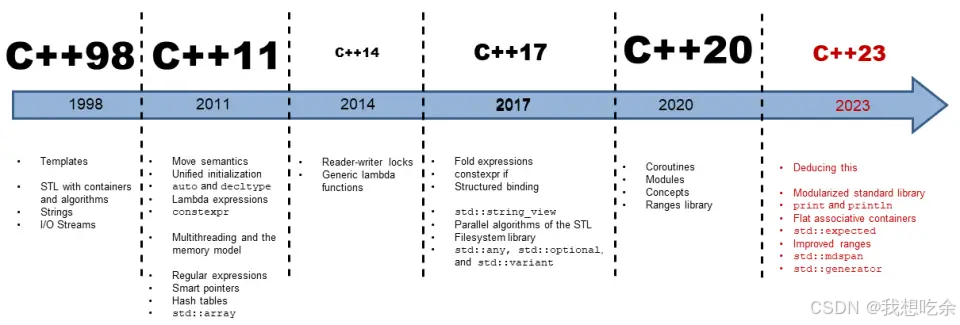 小插曲: 1998年是C++标准委员会成立的第一年,本来计划以后每5年视实际需要更新一次标准,C++国际标准委员会在研究C++ 03的下一个版本的时候,一开始计划是2007年发布,所以最初这个标准叫C++ 07。但是到06年的时候,官方觉得2007年肯定完不成C++ 07,而且官方觉得2008年可能也完不成。最后干脆叫C++ 0x。x的意思是不知道到底能在07还是08还是09年完成。结果2010年的时候也没完成,最后在2011年终于完成了C++标准。所以最终定名为C++11。
