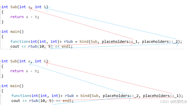 :是一个逗号分隔的参数列表,对应给定的callable的参数。当我们调用newCallable时,newCallable会调用callable,并传给它arg_list中的参数。占位符placeholders::_n: arg_list中的参数可能包含形如placeholders::_n的名字,其中n是一个整数,这些参数是“占位符”,表示newCallable的参数,它们占据了传递给newCallable的参数的“位置”。数值n表示生成的可调用对象中参数的位置,比如placeholders::_1为newCallable的第一个参数,placeholders::_2为第二个参数,以此类推。