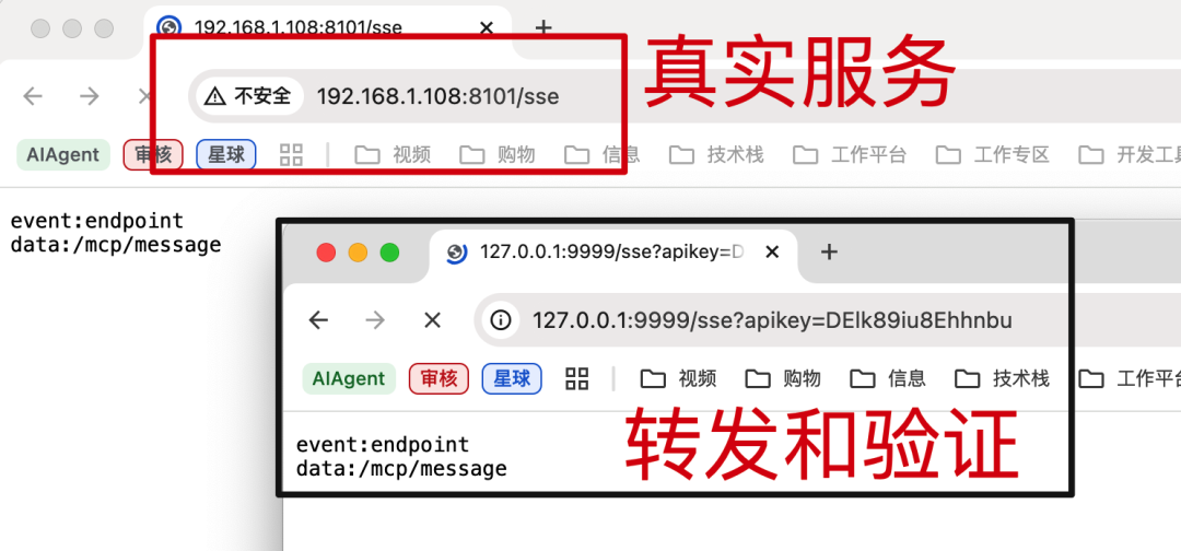 当我们有了一套基于 sse 形式访问的 mcp 后,我们是可以给这套 mcp 基于 nginx 转发的形式进行访问后面真实的 mcp 服务的。在转发的过程中,拿到用户在地址 http://127.0.0.1:9999/sse?apikey=DElk89iu8Ehhnbu