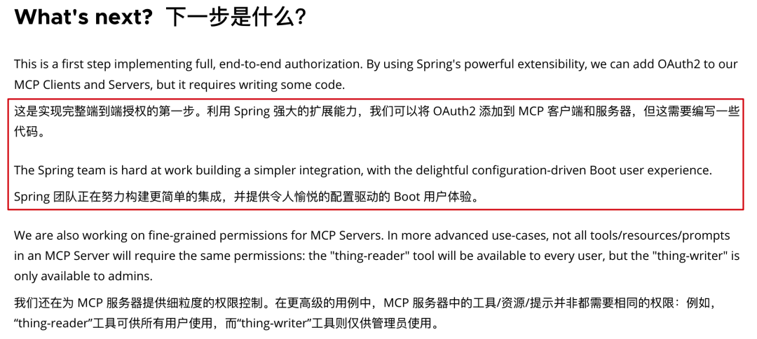 首先,Spring AI 是有意提供基于自家的 OAuth2 框架,完成 MCP 服务的多样性权限校验的。不过目前提供的方案能用,但不算成熟。