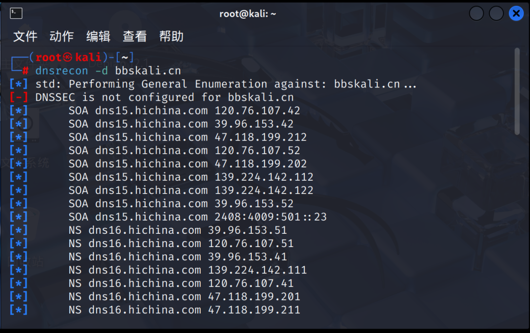 DNS查询主要用于域名枚举和信息收集。包括子域名、主机记录、MX 记录等。通过查询可以方便的掌握目标主机的IP地址,方便安全测试人员更好的了解目标。