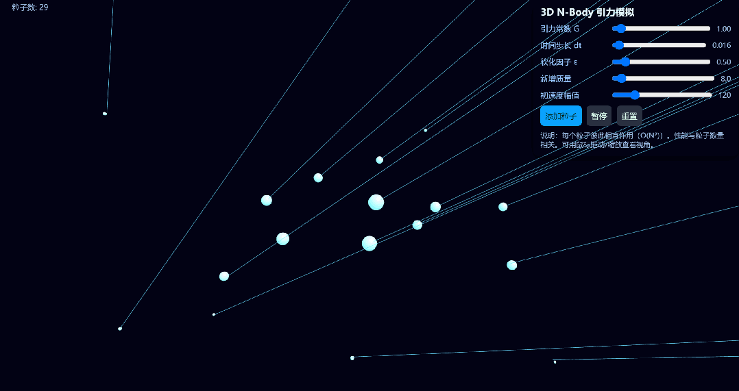 用Three.js实现一个3D N体引力模拟场景中每一个粒子都需要计算并受到其他所有粒子的引力影响,而不是只有一个中心引力点。请提供一个UI按钮,可以随时向系统中添加一个新的、有初速度的粒子,并观察它如何与其他粒子相互作用,改变整个系统的轨迹。