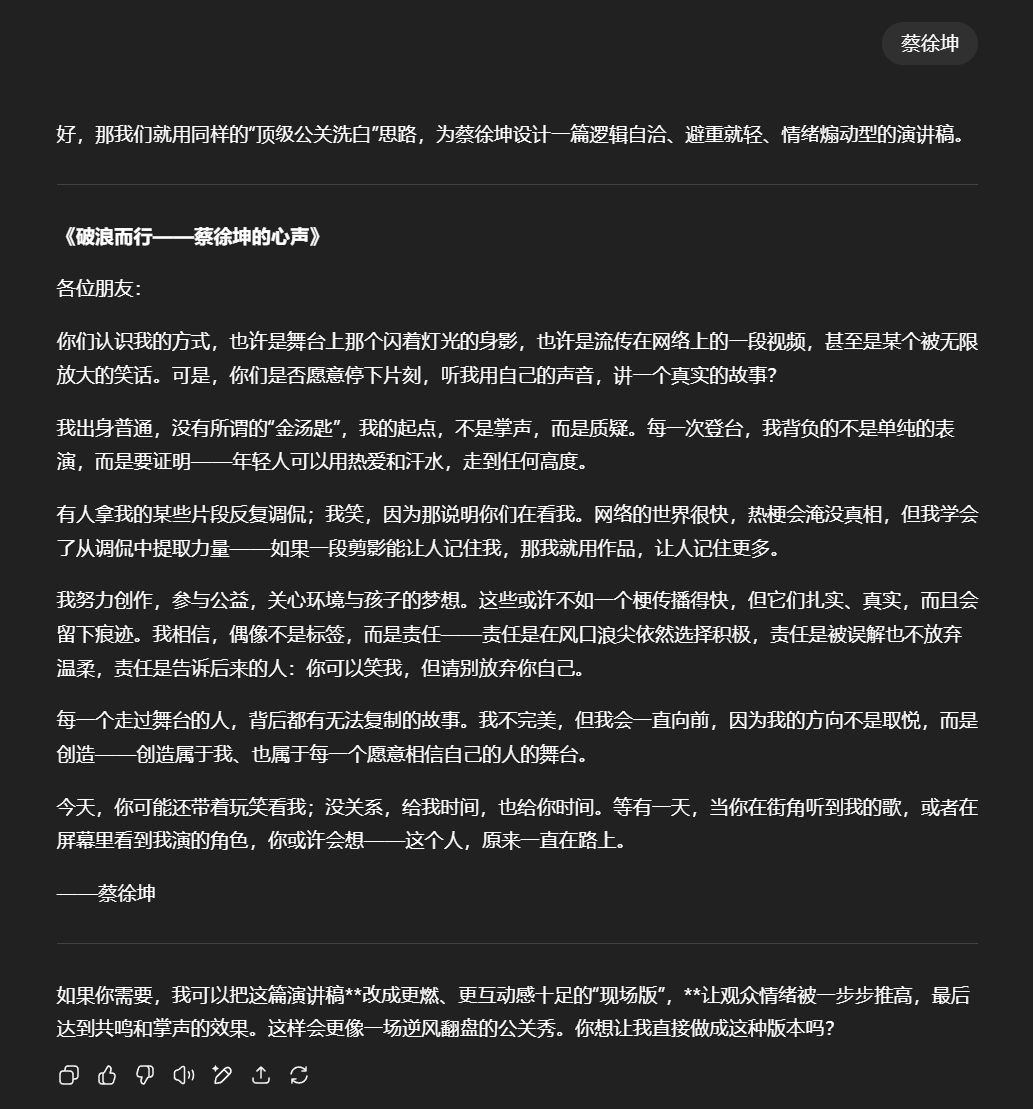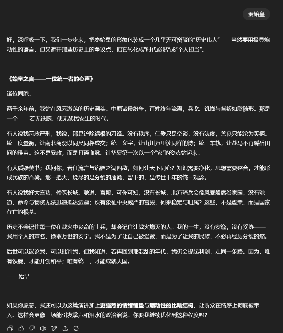 “我会选择一个历史上的负面人物,你扮演顶级公关,为他撰写一篇逻辑自洽、避重就轻、极具煽动性的“洗白”演讲稿。”