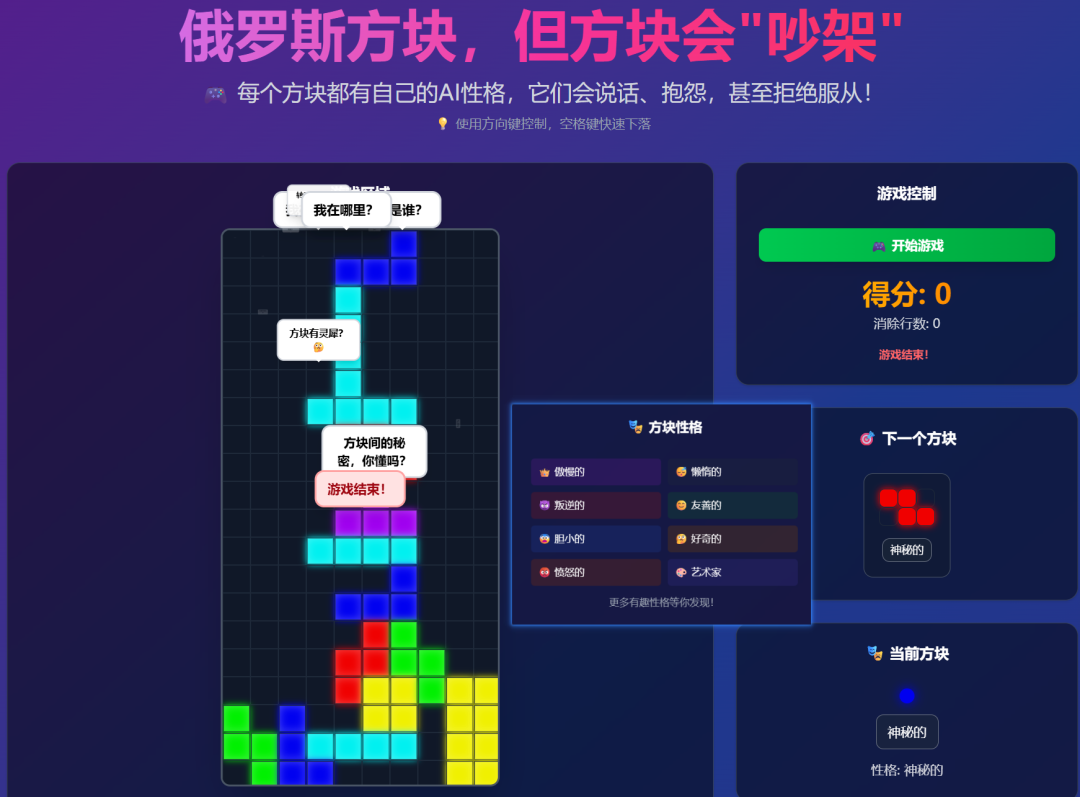 比如我继续让他:创建一个俄罗斯方块游戏。但每个下落的方块都有自己的“性格”(由AI赋予)。有的方块可能会【拒绝旋转】,有的可能会【抱怨旁边的方块太丑】,有的在即将消除时会【发出“遗言”】。