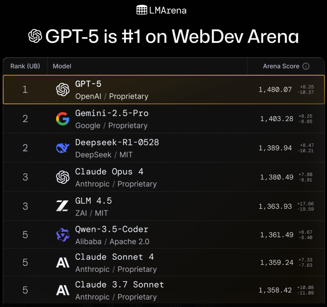 在 WebDev Arena 中,GPT-5 创下了新纪录: 比 Gemini 75 Pro +2.5 分 +100 分,高于 Claude Opus 4 迄今为止用于实际编码的最佳模型。