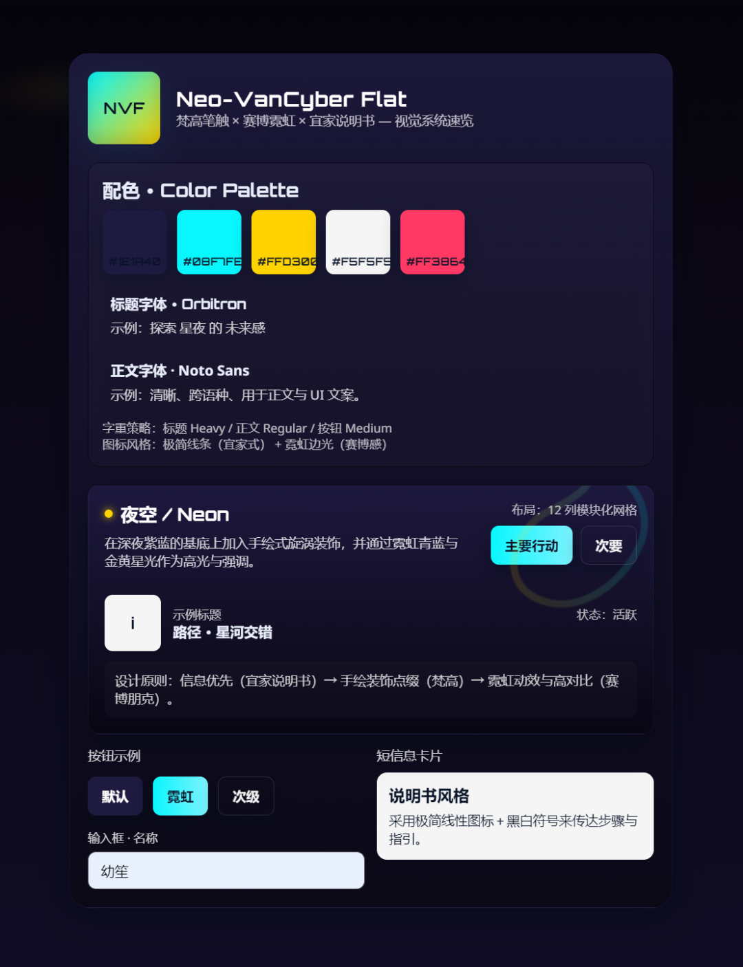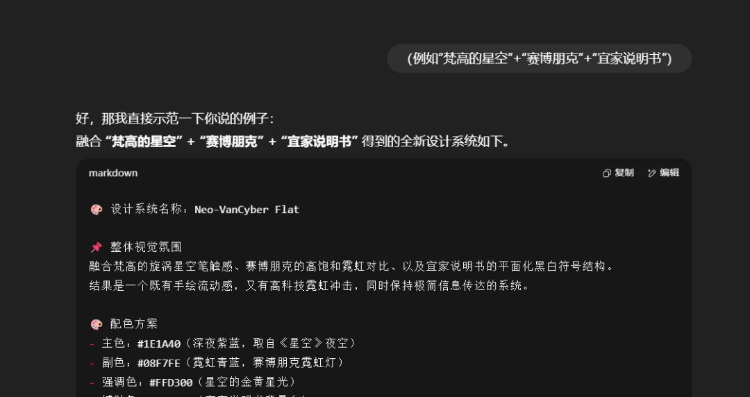 我输入两种或多种毫不相干的艺术/设计风格,你会自动分析这些风格的核心视觉元素,并生成一套融合了所有特点的、全新的、可用的“设计系统”(包含配色、字体、组件样式)。并最终用卡片代码的样式显示。
