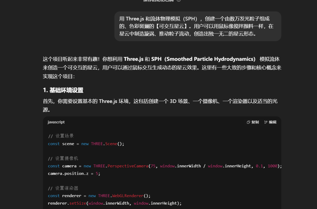 用 Three.js 和流体物理模拟(SPH),创建一个由数万发光粒子组成的、色彩斑斓的【可交互星云】。用户可以用鼠标像搅拌颜料一样,在星云中制造漩涡、推动粒子流动,创造出独一无二的星云形态。