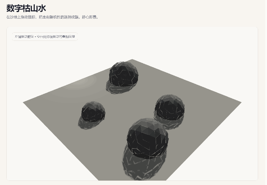 用 Three.js 创建一个【数字枯山水】庭院。场景是一个铺满细沙的方形区域,