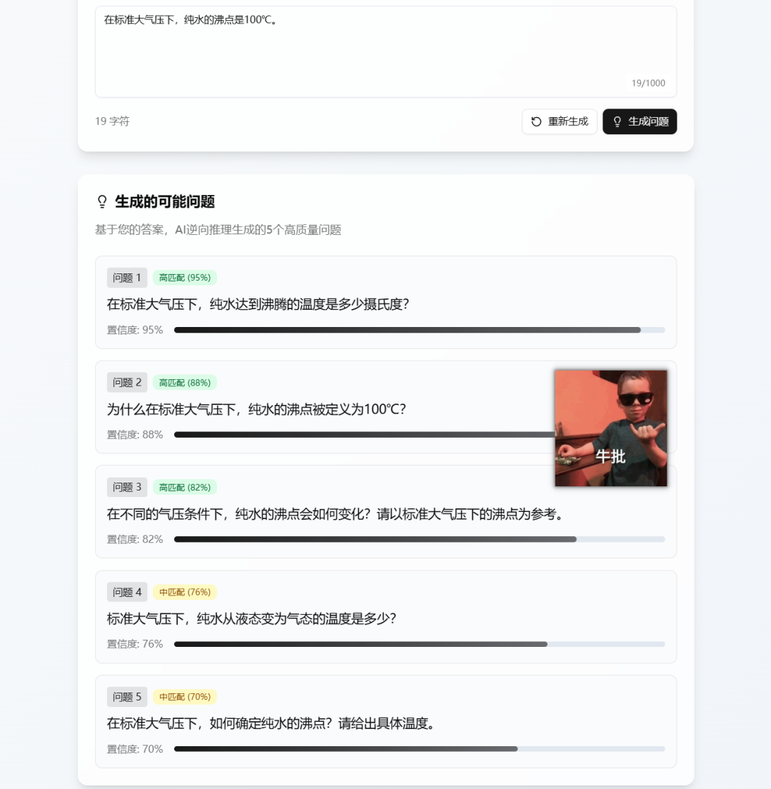 构建一个“反向搜索引擎”。用户输入一句话或一段文字作为“答案”。Agent会进行【逆向推理和联想】,生成5个最有可能导致这个“答案”出现的【高质量、有深度的“问题”】