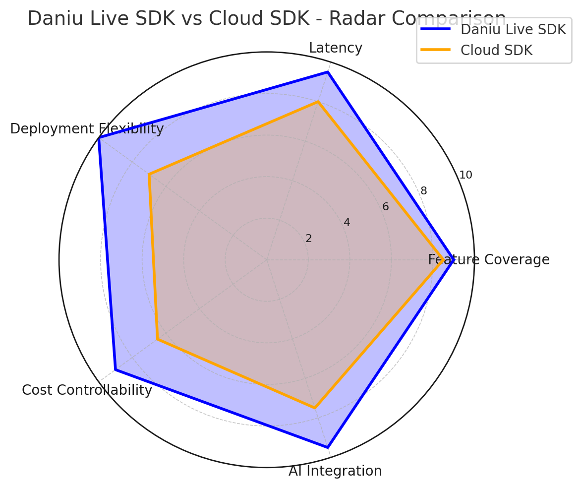 为了让两类方案的差异一目了然,我们将功能覆盖度、延迟、部署灵活性、成本可控性、AI适配度五个核心维度进行量化评估,并绘制成雷达图:
