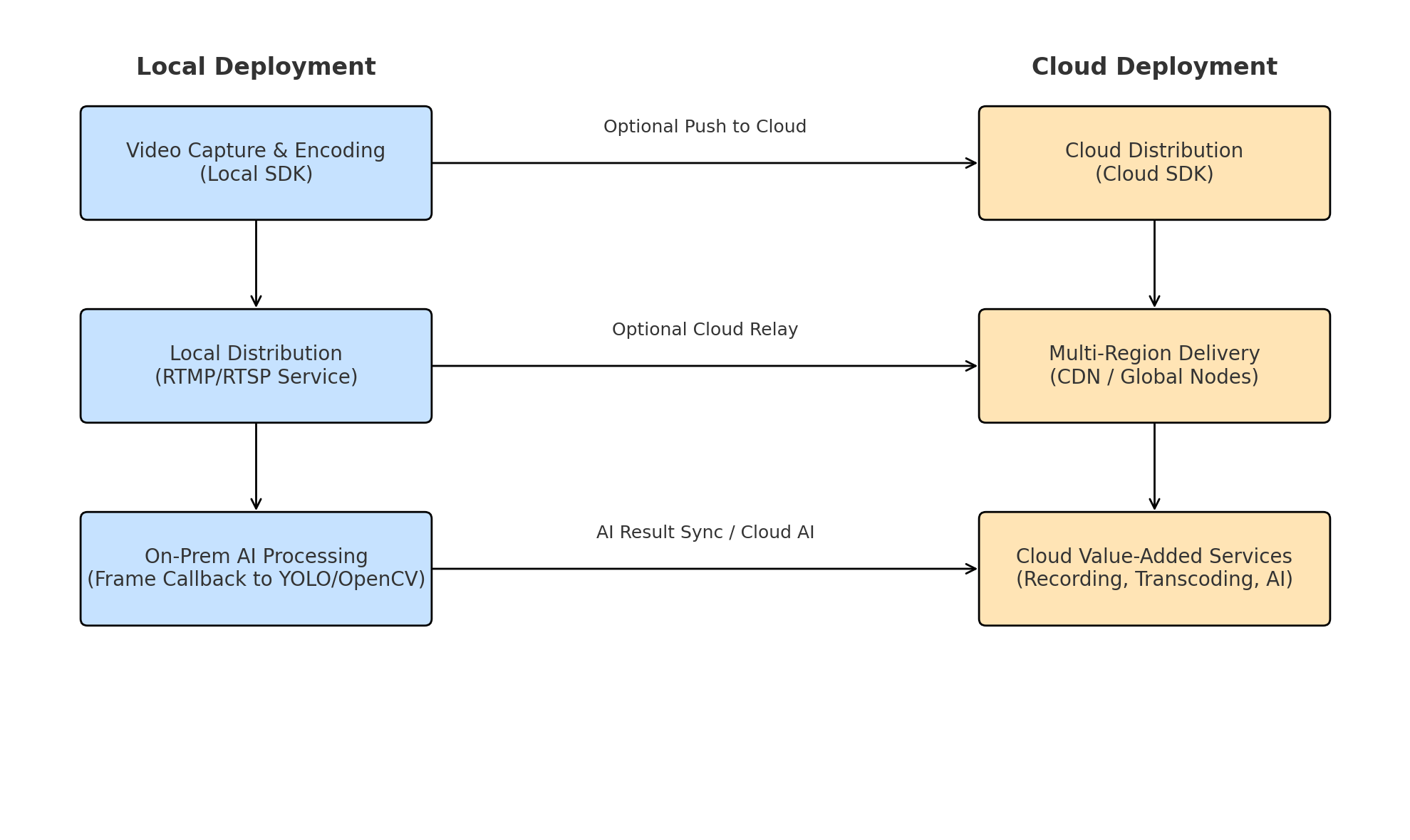 本地分发与AI分析 | 本地部署 SDK | 内网分发视频流,同时通过帧回调直接接入本地 AI 模型进行识别、检测、跟踪 |