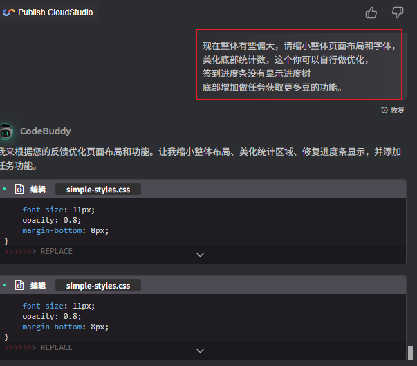 让我印象深刻的是CodeBuddy对需求的理解能力。当我说"我需要一个签到功能"时,它不仅仅是简单地生成一个按钮,而是: