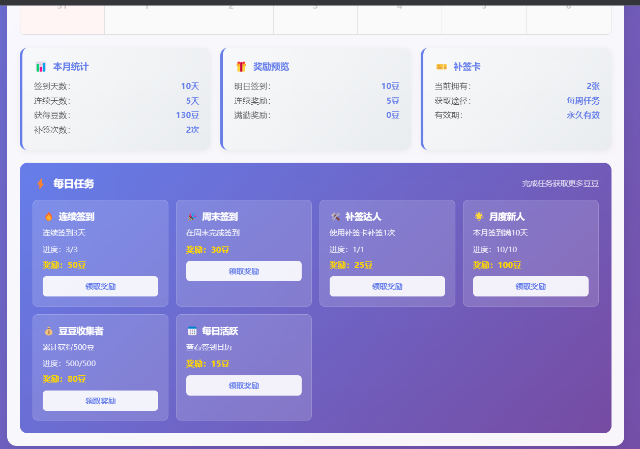 ├── 奖励系统(基础奖励、连续奖励、周末双倍)