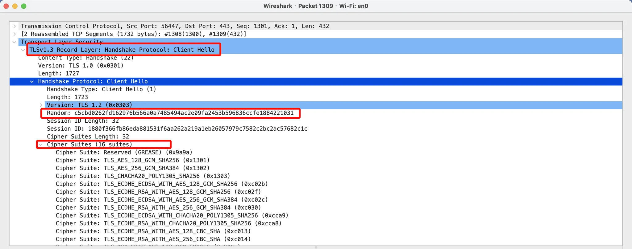 随机数(Client Random)、加密套件(Cipher Suites)、扩展列表都有