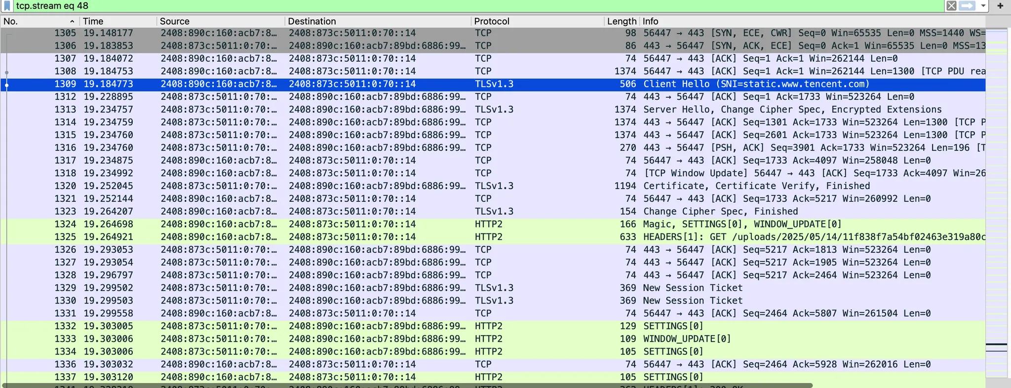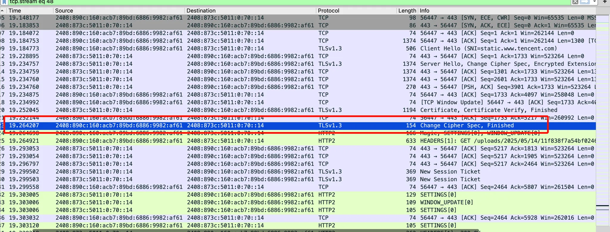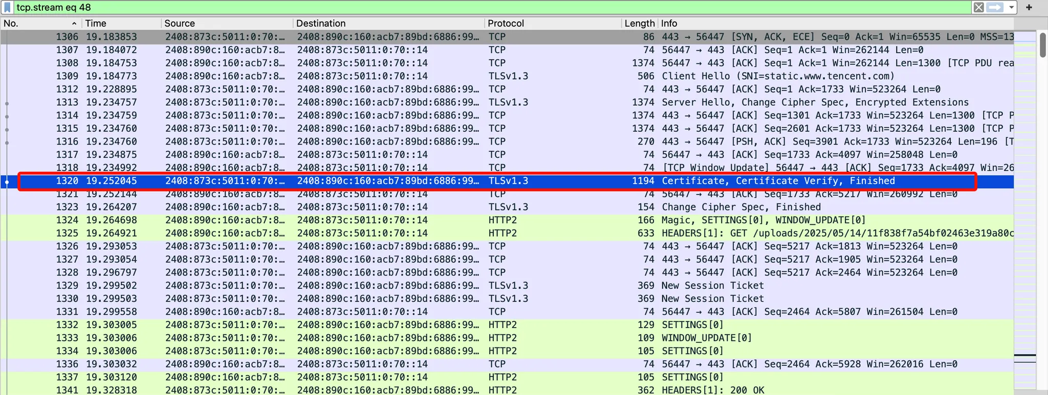 tls.handshake.type == 1 or tls.handshake.type == 2ClientHello → ServerHello → EncryptedExtensions → Certificate → CertificateVerify → Finished这样就能看到完整的SSL交互过程