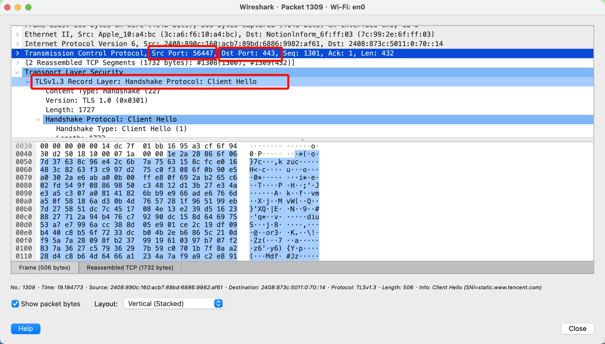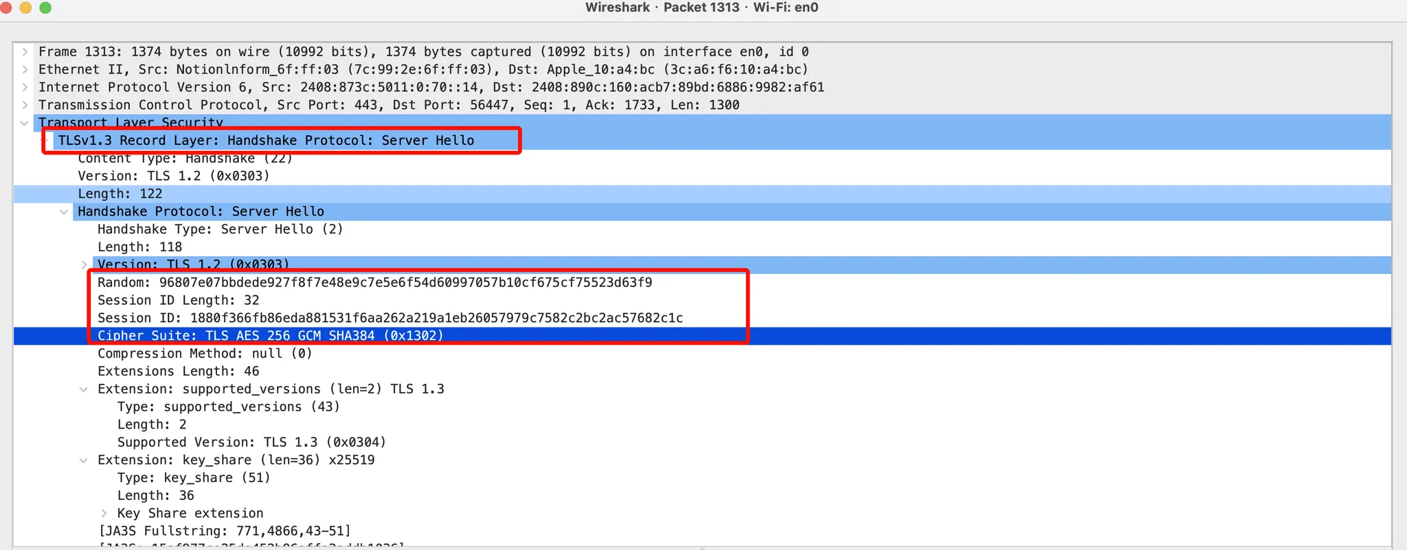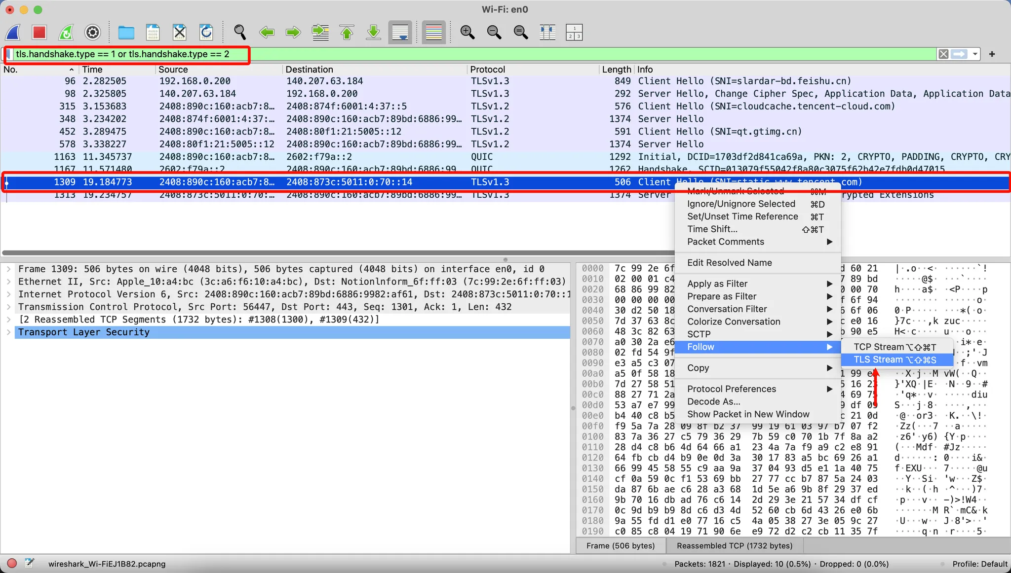 tls.handshake.type == 1 or tls.handshake.type == 2ClientHello → ServerHello → EncryptedExtensions → Certificate → CertificateVerify → Finished这样就能看到完整的SSL交互过程