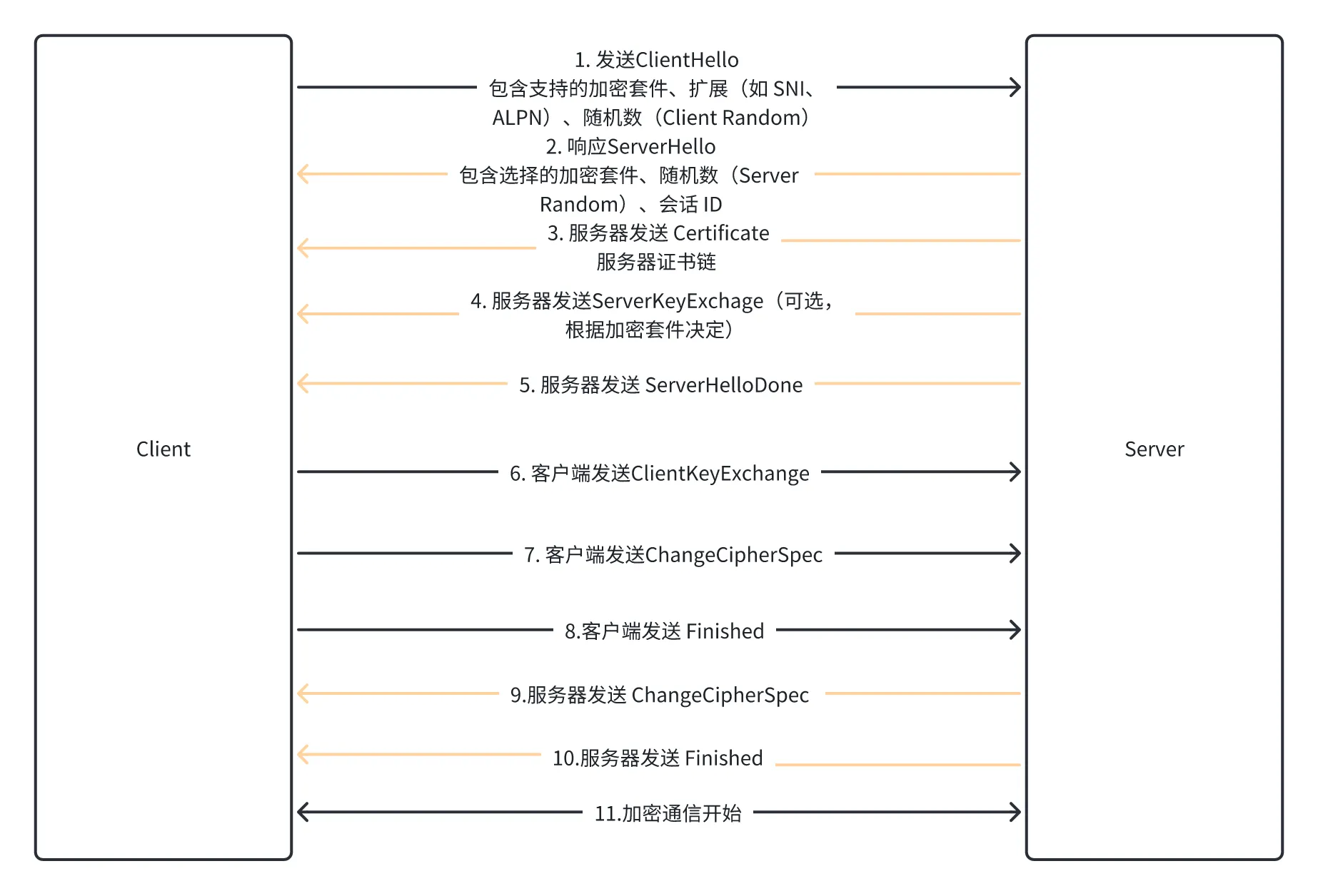 ClientHelloTLS_ECDHE_RAS+WITH_AES_128_GCM_SHA256ServerHelloTLS_RSA_WITH_AES_256_CBC_SHA256。null(现代服务通常禁用压缩)。CertificateServerKeyExchage (可选,根据加密套件决定)ServerHelloDoneClientKeyExchangeChangeCipherSpecFinishedChangeCipherSpecFinished