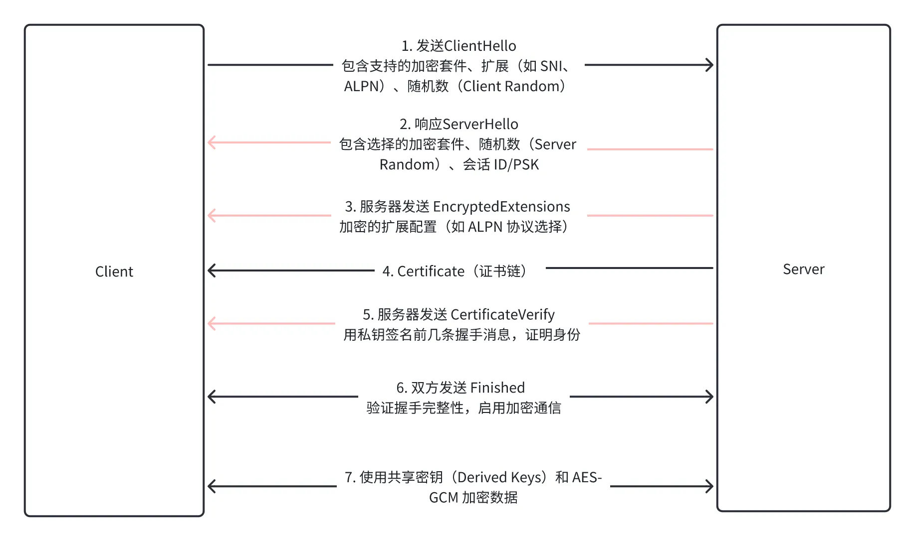ClientHelloTLS_AES_256_GCM_SHA384ServerHelloTLS_CHACHA20_POLY1305_SHA256**。EncryptedExtensions。EncryptedExtensionssigned_certificate_timestamp**(用于证书透明性)。example.com 的公钥证书)。CertificateVerifyClientHello 和 ServerHello)生成签名,并发送给客户端Finished 消息Finished 消息的摘要(如 HMAC),验证握手消息的完整性二、图示TLS 1.3 握手过程