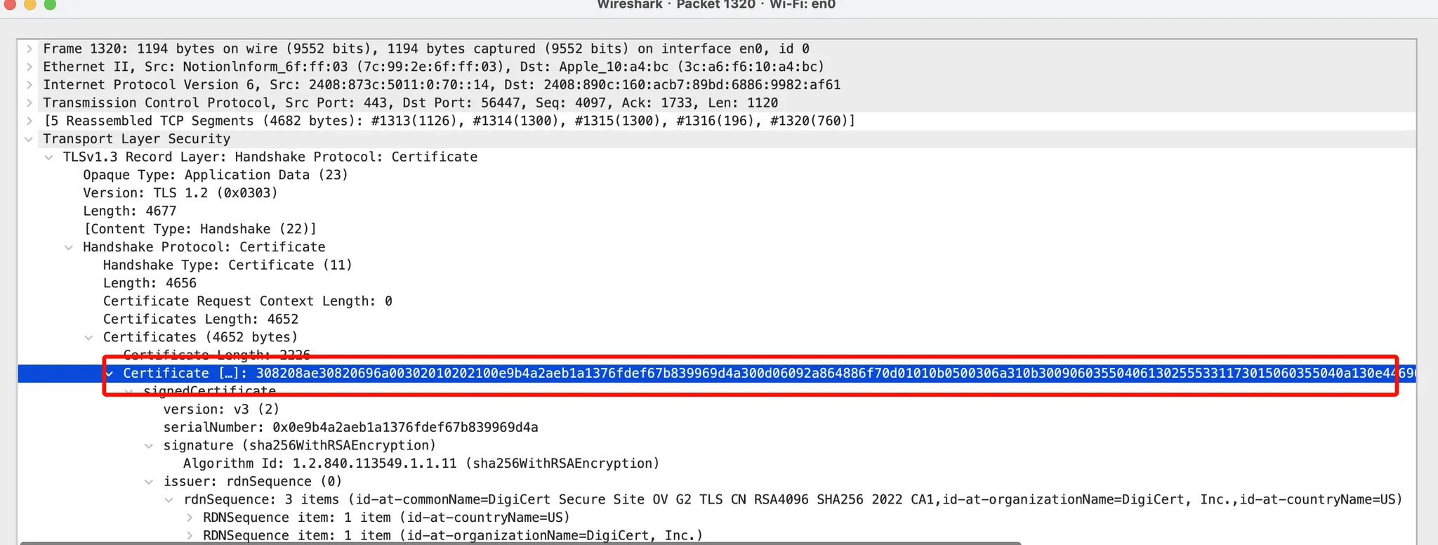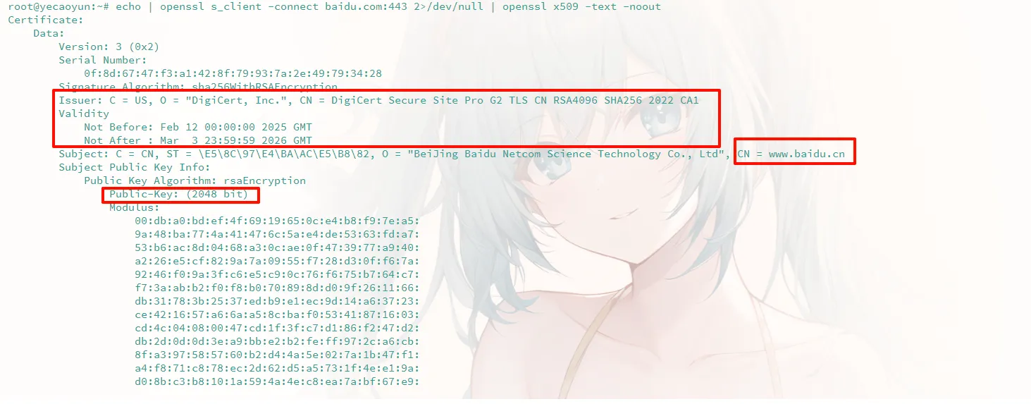 OpenSSL 工具使用 openssl s_client 连接到目标网站,获取证书链,再用 openssl x509 解析证书内容。