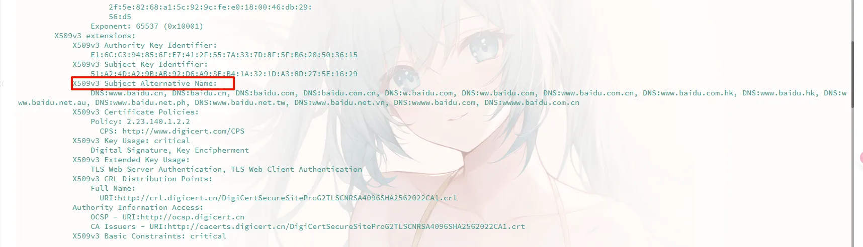 Subject Alternative Name (SAN) :扩展域名(如 DNS:example.com, DNS:*.example.com)。