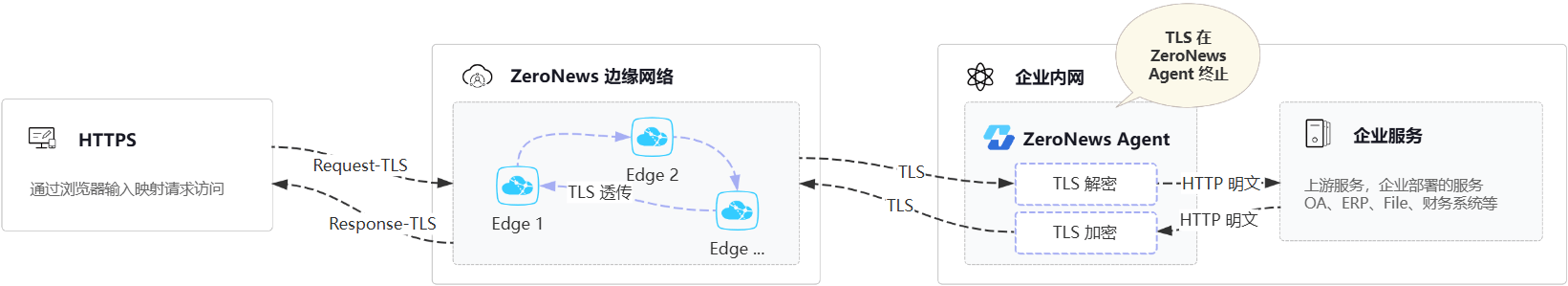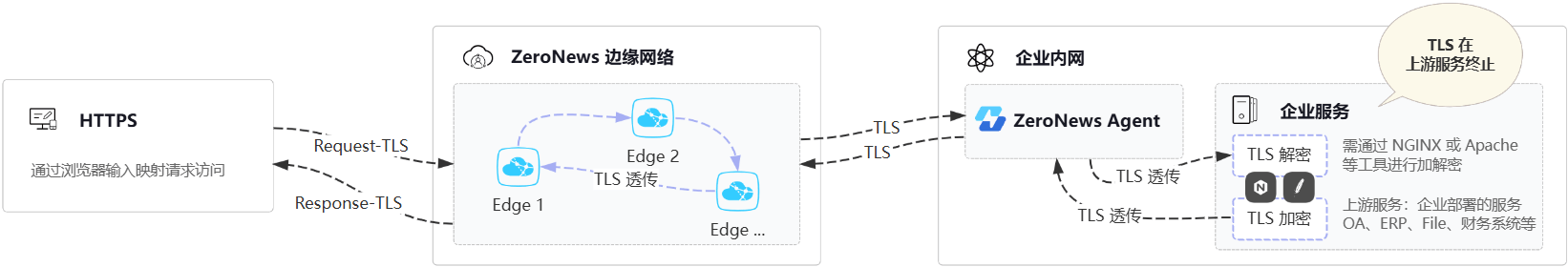 如果您无法在上游服务终止您的TLS,且不需要在 ZeroNews Agent 终止 TLS,您可以通过 ZeroNews 在我们的云端边缘上为您终止 TLS,如上所述,后续的数据我们通过自研加密隧道将流量转发到您的代理。