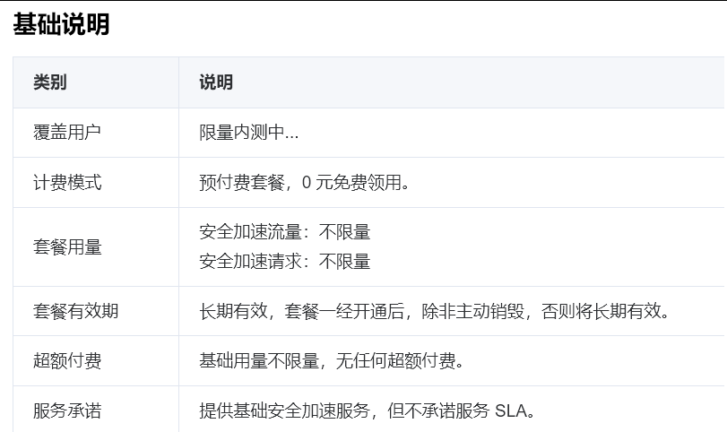 现在EdgeOne免费版套餐开放限量内测,免费套餐接入的群体是个人兴趣爱好开发者,正在打磨 MVP 的技术团队,公益类、教育类等非盈利性项目,技术验证阶段的初创网站等愿意遵守规则并反馈产品建议的共建者。免费套餐主要提供缓存并加速网页及网站内容的交付,不提供视频或其他大型文件业务(包括但不限于高比例图片、音视频文件,游戏安装包等)。