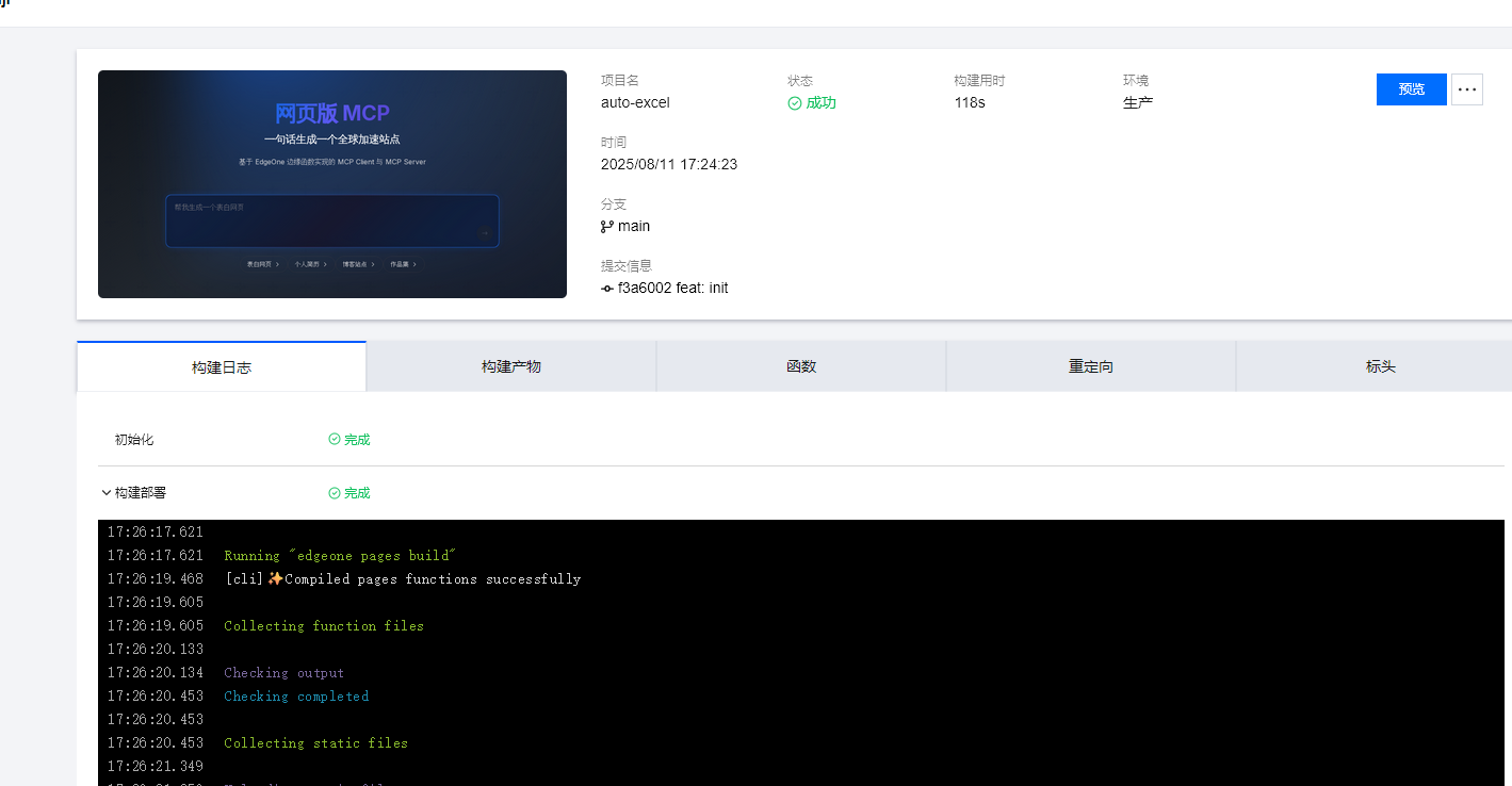 通过以上流程,我们在短短 5 分钟 内,便利用 EdgeOne Pages 成功部署了一个可用的 MCP 服务网站,并实现了 Excel 自动排版、可视化图表生成以及智能分析报告等功能。整个过程几乎不涉及复杂的运维操作,只需配置好环境变量与代码仓库,即可完成上线,让 AI 服务快速面向全球用户。