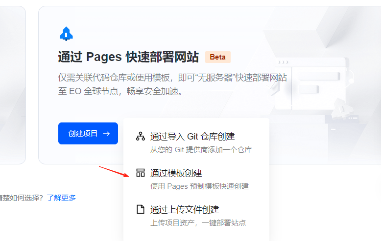 进入到后台界面我们可以发现有使用Pages快速部署网站这一列,点击创建项目,这里我们选择通过模板创建: