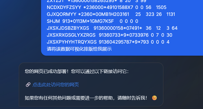 可以看到已经为我们生成了一个可展示的网页了。以上还是基础能力,我们制作的是Excel自动排版MCP,通过该MCP我们可以直接传给对方网址而不是传输excel再下载才能看: