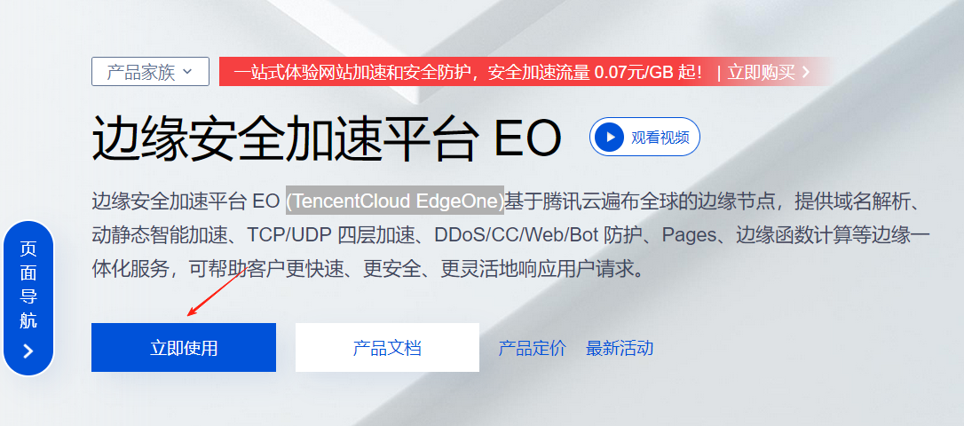 首先我们需要先登录到腾讯云,搜索EdgeOne,可以发现边缘安全加速平台 EO (TencentCloud EdgeOne),点击立即使用进入EdgeOne控制台: