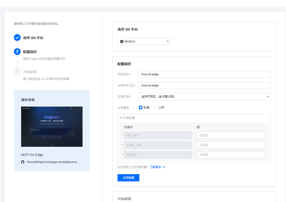 这里需要注意填写环境变量,我们可以通过MCP on Edge模板快速部署基于 EdgeOne 边缘函数实现的 MCP Client 与 MCP Server,其中的环境变量 API_KEY,BASE_URL,MODEL 兼容了 OpenAI 的接口规范,这意味着您可以直接按照 OpenAI 官方的使用方式来配置这几个变量。