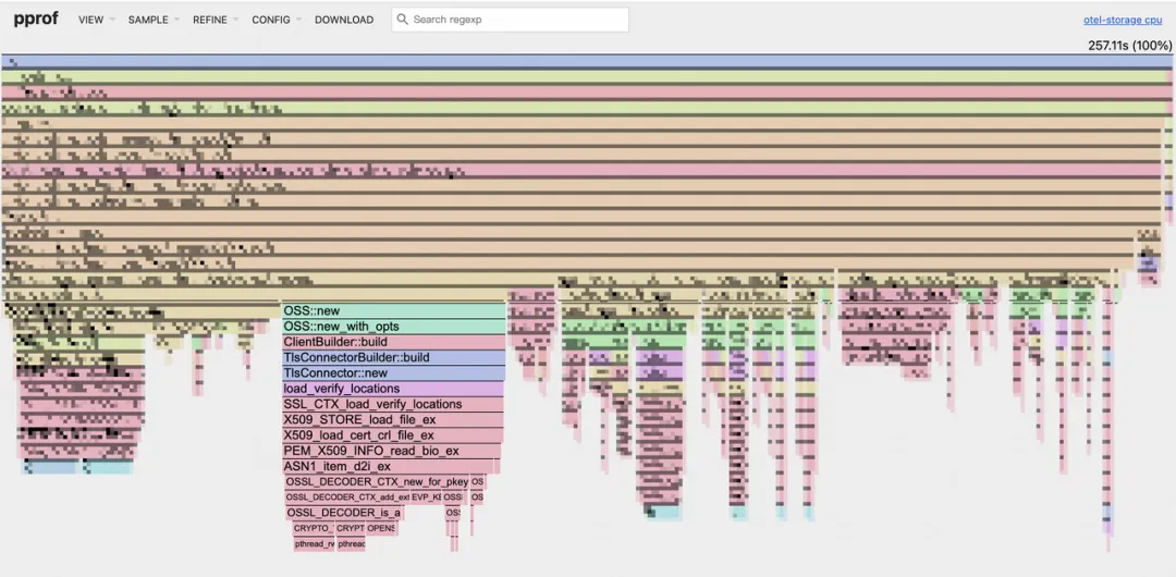 在我们的 CPU 火焰图中,一个令人意外的瓶颈浮出水面:OSS::new 占用了约 19.1% 的 CPU 时间。深入分析后发现, OSS::new 内部的 TlsConnector 在每次新建连接时都会进行 TLS 握手,这是导致 CPU 占用过高的根本原因。