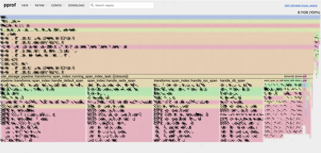 go tool pprof -http=localhost:8080 ./target/debug/otel-storage ./otel_storage_cpu_profile_20250806_032509.pb通过 go tool pprof 启动的 Web UI,我们可以看到程序的火焰图。