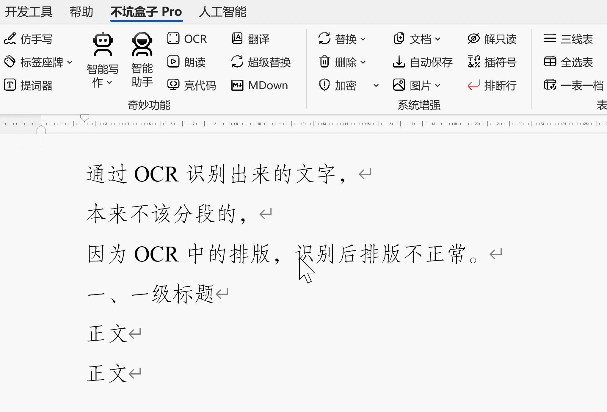 细心的你会发现:这个功能会智能处理本来就可能单独成行的标题,但那种不规范的标题可能会无法正常处理,比如:一.、(一)、、(1)。