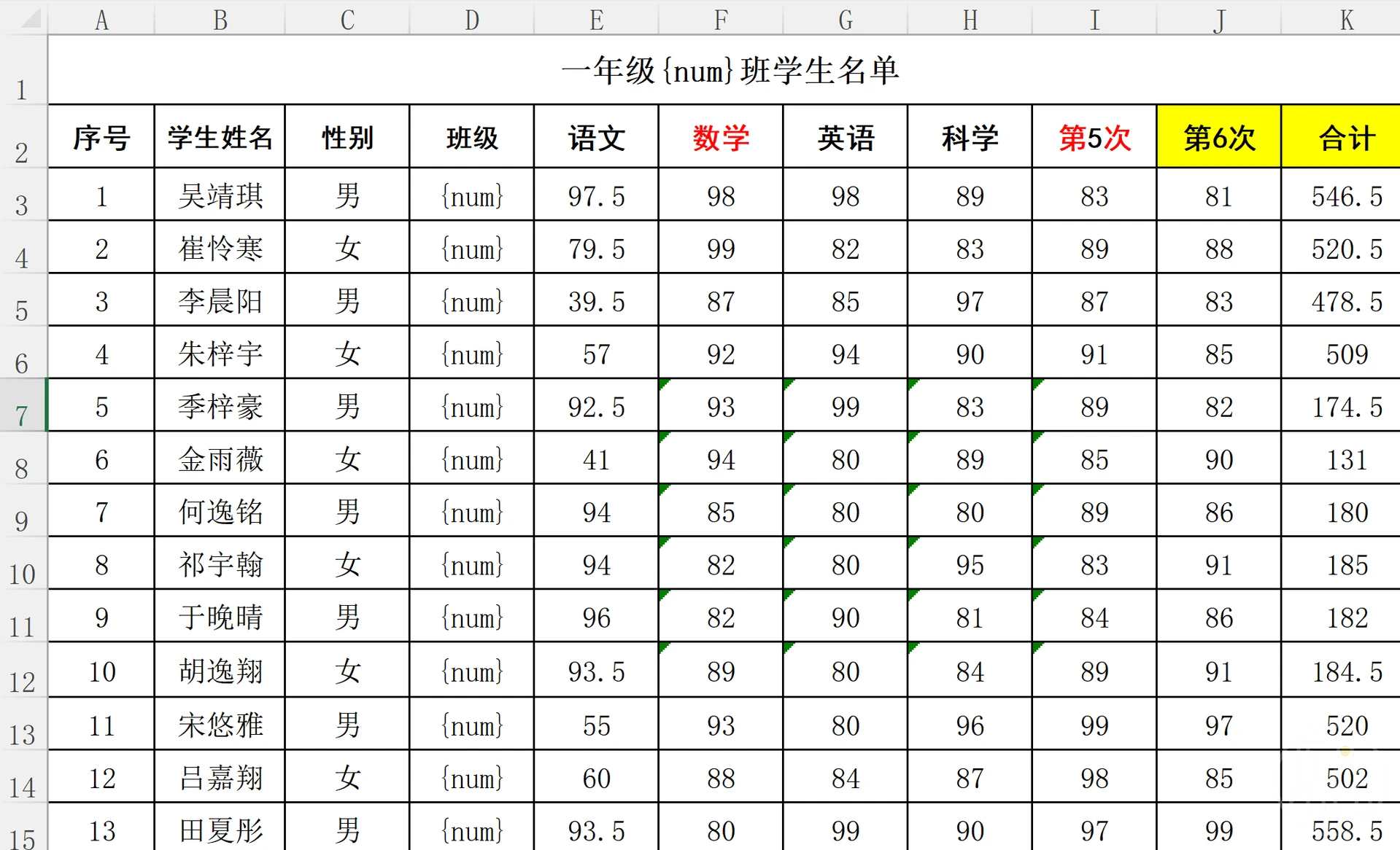 看到上面总表中的{num}了吗?在总表中填好这个东西,分班后它就会自动变成相应的班级号。