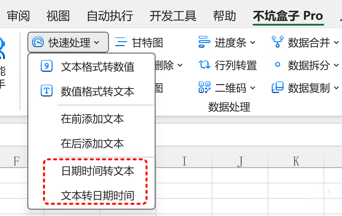 将对单元格数据的一些快速操作归纳进“快速处理”菜单下,包括:文转数、数转文、在前加文本、在后加文本、日期时间转文本、文本转日期时间。