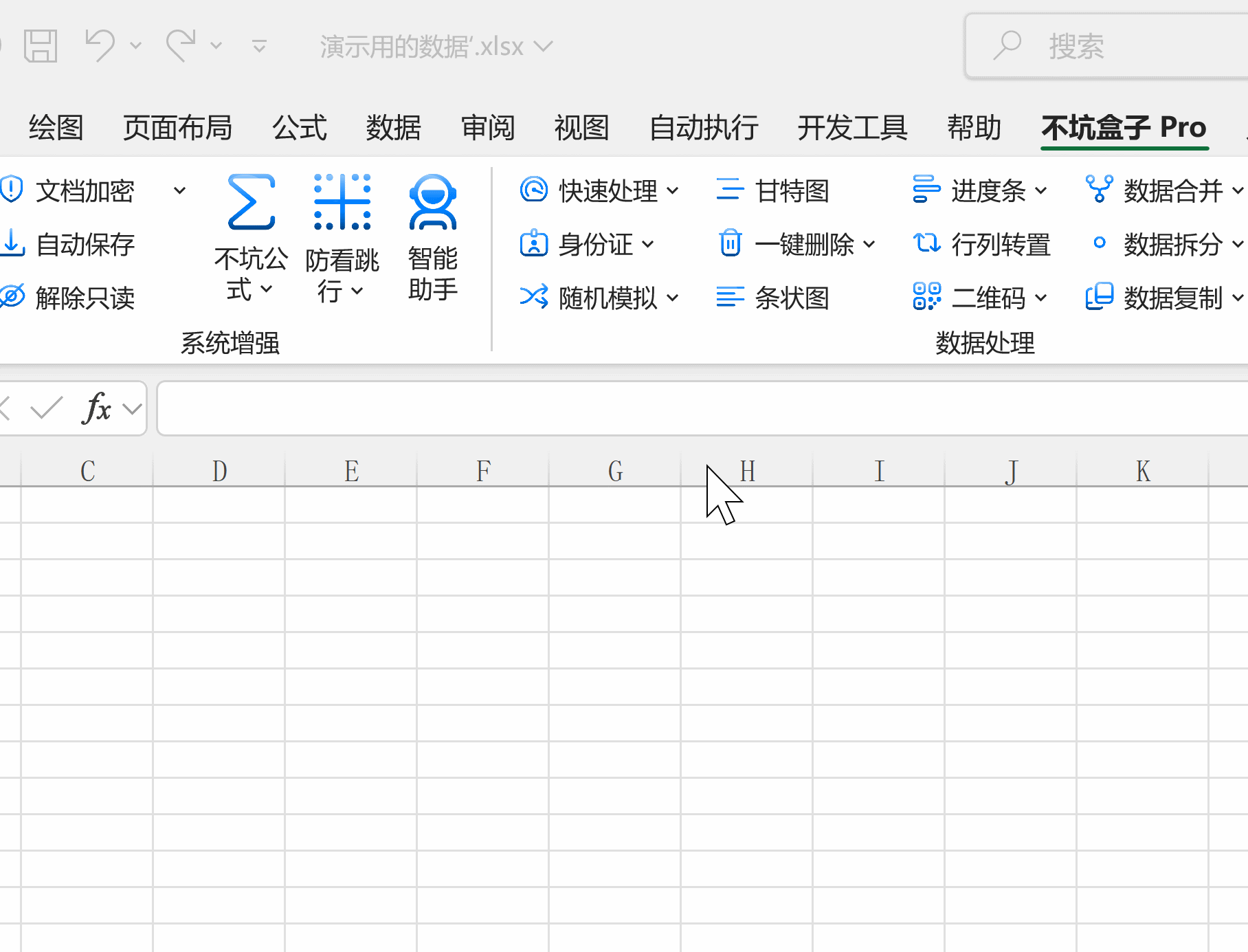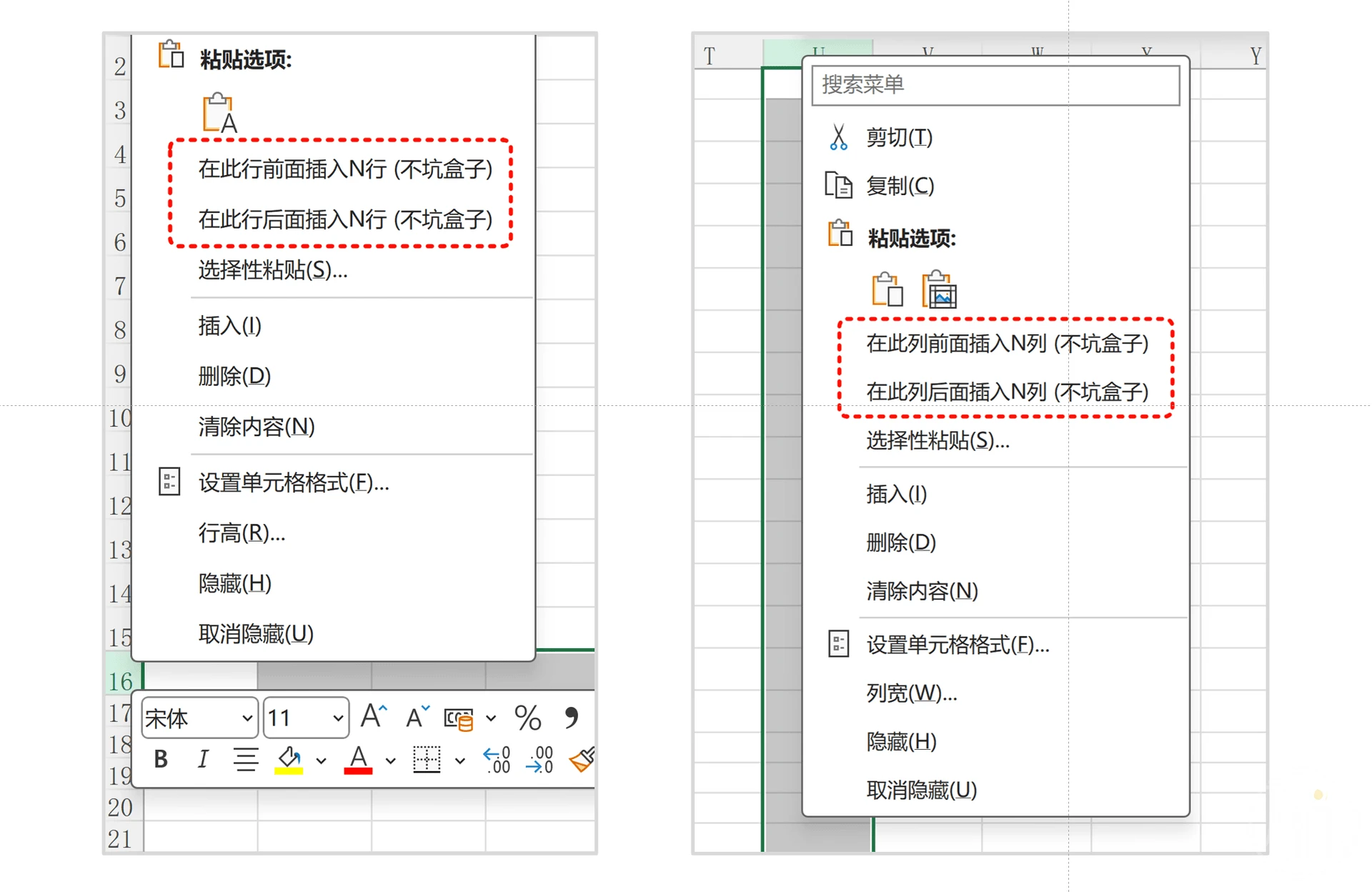 在安装2025.08.11版本的不坑盒子后,在右键点击行号、列号的时候,会显示“在此前面插入N行”等字样,点击即可瞬间插入任意行/列。