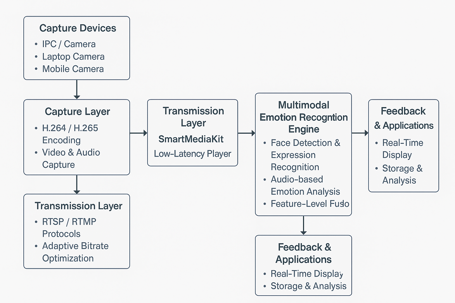 6. 结语与展望 随着深度学习与视频技术的不断融合,情绪识别正从“实验室可行”加速走向“业务可用”。在这一过程中,视频链路的低延迟与稳定性 与 情绪识别模型的准确率与鲁棒性 一样重要。大牛直播SDK(SmartMediaKit)通过 RTSP、RTMP 等低延迟播放模块,为多模态情绪识别系统提供了稳定、高效、跨平台的视频输入能力,使得 AI 推理结果能够在真实场景中做到秒级甚至毫秒级反馈。