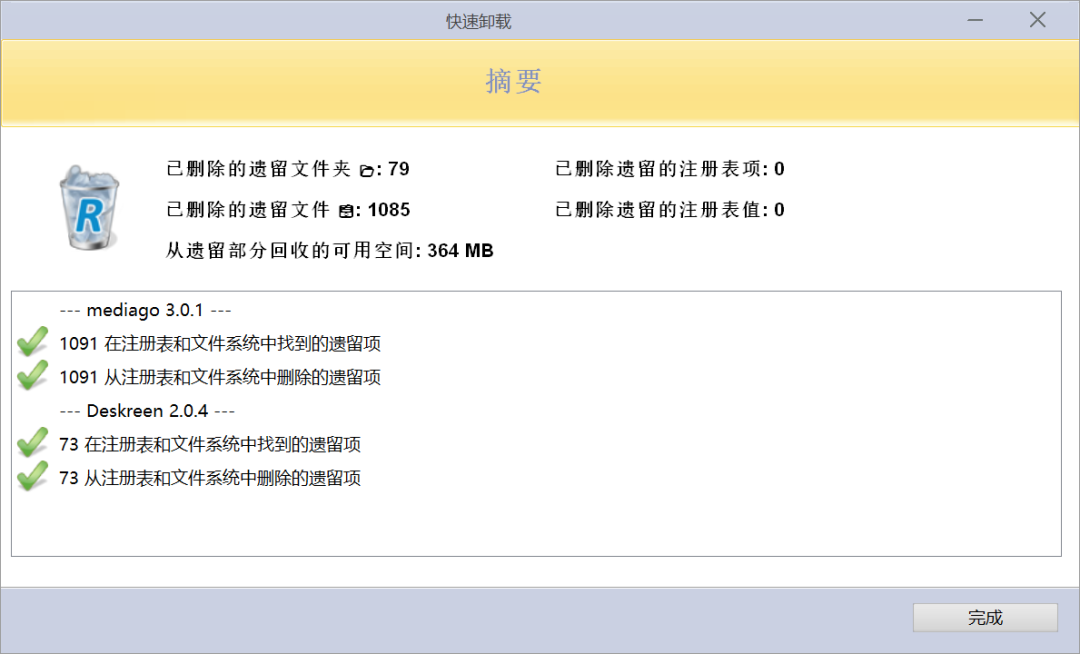 我卸了两个程序,一共清理掉 1091 条注册表残留信息,还有 73 个系统残留文件和文件夹。