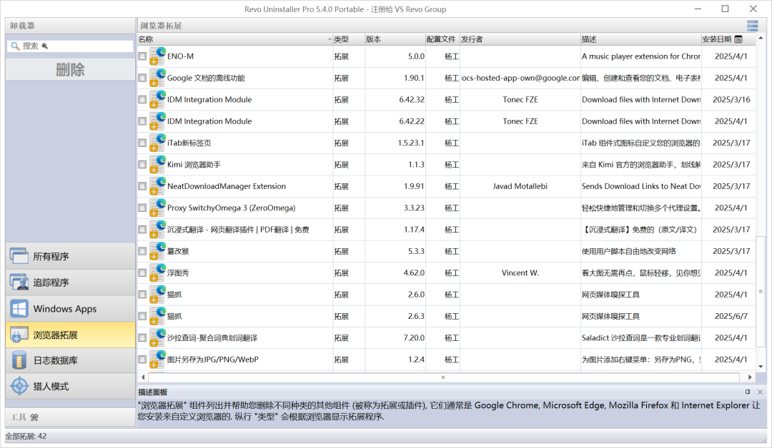 浏览器拓展管理:软件还能管理浏览器的拓展,支持卸载和导出功能。