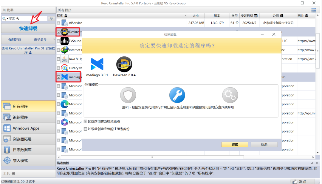 软件卸载:软件卸载是最常用的功能。和系统控制面板只能单个卸载不同,RevoUninstaller Pro 可以同时卸载多个程序。
