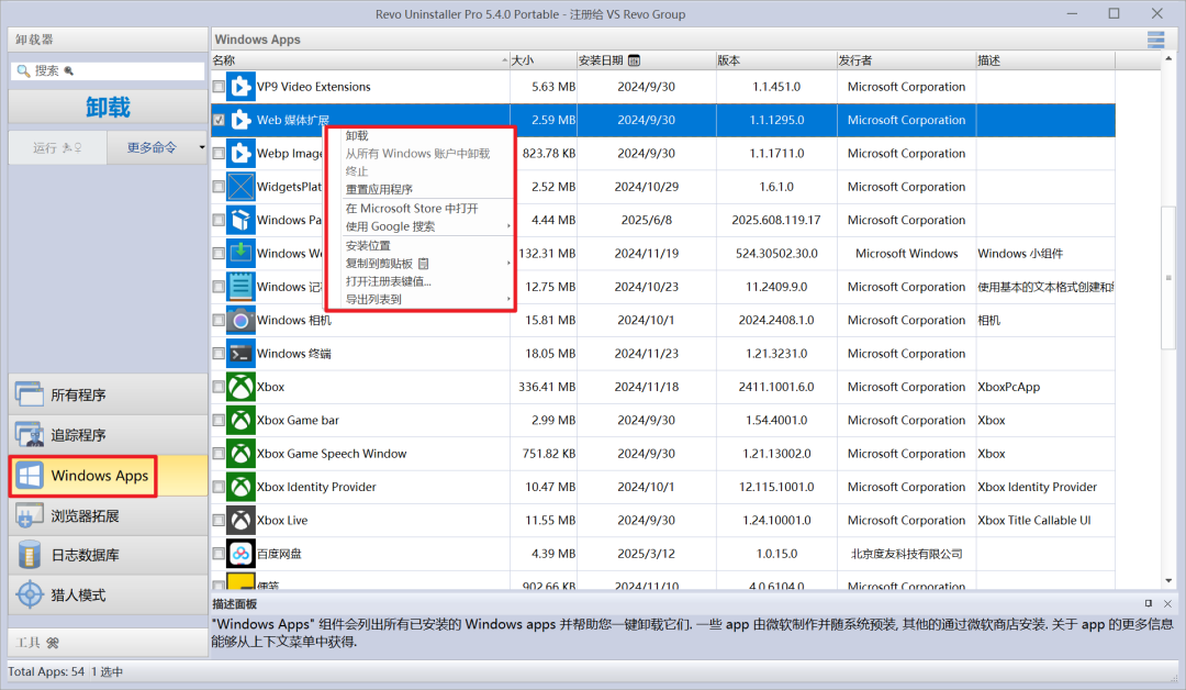 用 RevoUninstaller Pro 就能对它们进行完全卸载、打开注册表键值、重置应用程序等操作。