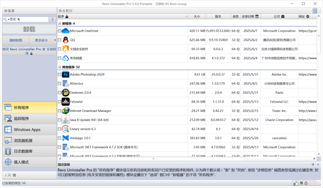 这款工具叫 RevoUninstaller,是国外软件公司开发的。今天推荐的是 5.4.0 版本,它是绿色单文件版,打开就是已注册状态,到期时间是 2079 年,完全够大家长期使用!