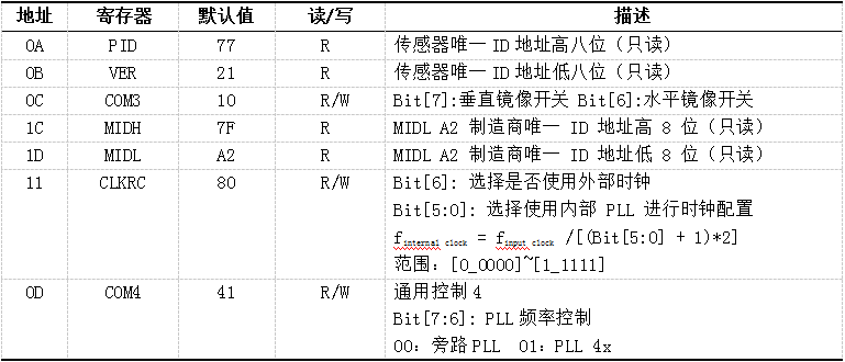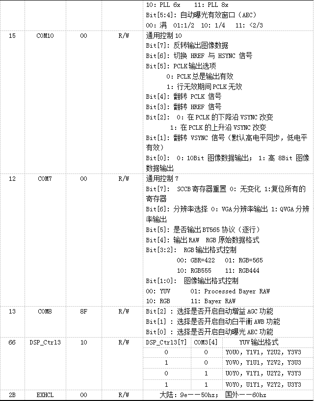 Ov7725 CMOS Sensor一共有172个配置寄存器,在这172个寄存器中,有的只能读,有的只能写,有的则既可读又可写。在传感器正式工作之前,必须首先对寄存器进行正确的配置,否则将无法得到预期的工作模式,更别说得到较好的画质和相应的图像效果。然而这172个寄存器并非都需要我们配置,需要我们配置的只是个别重要的寄存器。其配置的方式就是通过SCCB总线进行相关操作,其余寄存器则采用默认值。表2-2中所介绍的寄存器主要与视频图像输出格式、采样画质、曝光参数等有关。